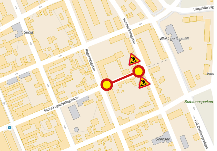På grund av ett kabelfel som måste åtgärdas behöver vi utföra grävjobb längs med Södra Fogdelyckegatan 41-48 (mellan Regeringsgatan och Hantverkaregatan), se karta. Arbetet startar onsdag 25 augusti och beräknas pågå vecka 34. Dagtid är sträckan avstängd och trafiken kommer dirigeras om men under kväll och natt är sträckan öppen för trafik. Välj om möjligt annan väg.